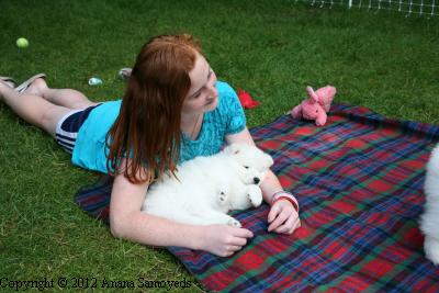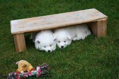 Tatiana, from Moonstar Samoyeds, having some fun with pups.
