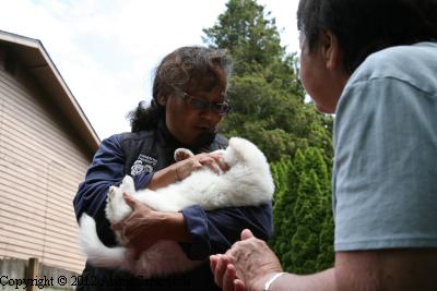 Sakura, also from Moonstar Samoyeds, doing some preliminary evaluations of our pups.